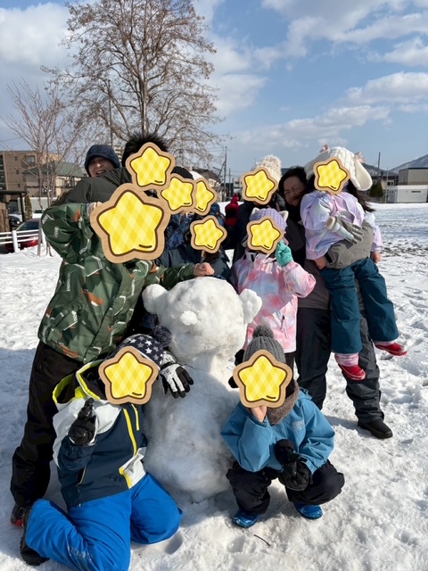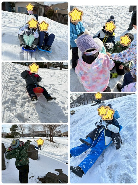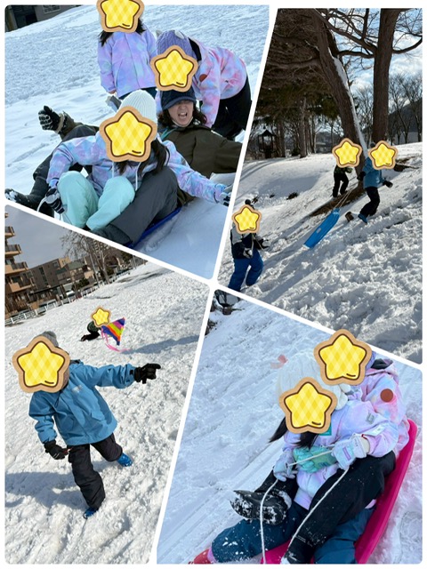 ところどころ地面が見えている所もありましたがソリ滑りや雪だるま制作、雪合戦など思い切り楽しみました💕