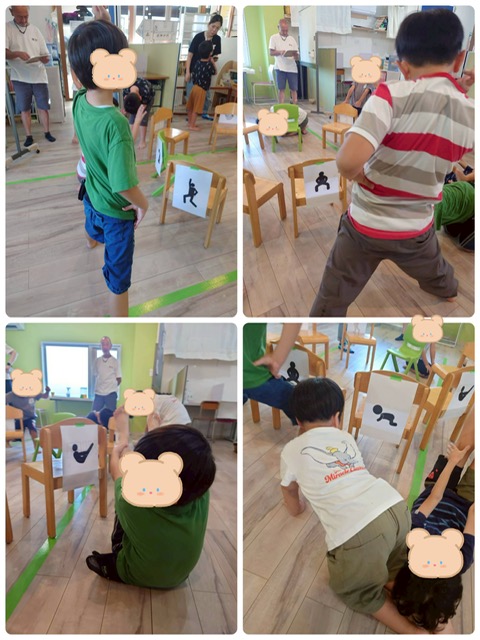 音楽が流れている間椅子の周りを行進し、音楽が止まった時に椅子に書いてあるポーズと同じポーズを瞬時に行うというものです👍