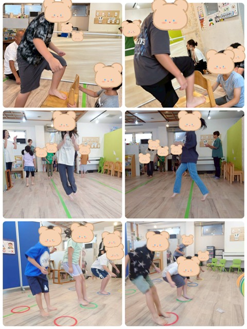 小さなフープから小さなフープに飛び移ってストップ動作は、おしりがムズムズ落ち着かない子に対し有効的なんです。どんどん距離を伸ばしていきましたが皆とっても上手!