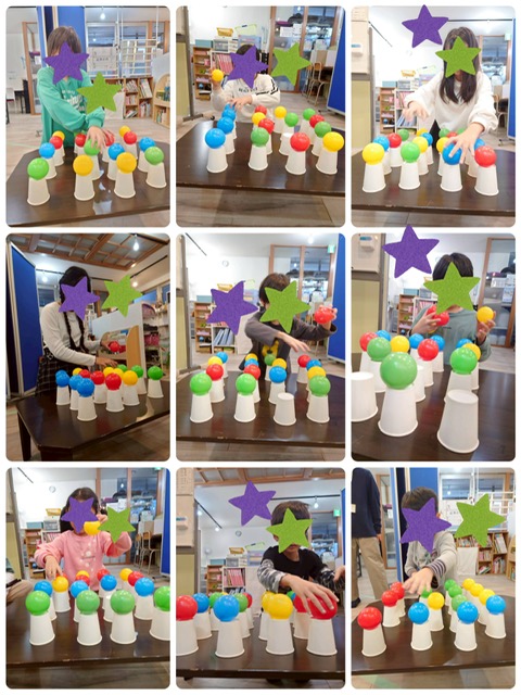 不安定な紙コップの上にカラーボールをランダムに置き、一列に色を揃えて並べていき、タイムを競います。