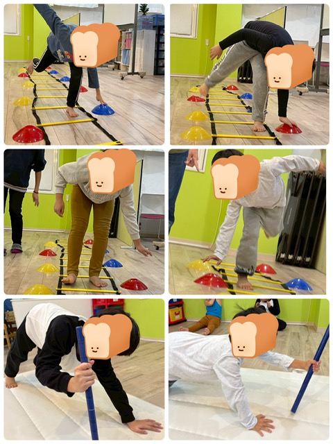 コーンが置いてある方と同じ手と足を置き、バランスが崩れないようにリズムよく進んでいきます。状況判断や体幹、バランス感覚が必要となり、難易度が高い説明を一回で聞き取れるかも見ていたのですが難易度高い中、みんな集中してとても頑張っていました☆