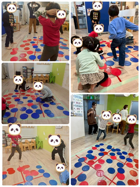 チェッチェッコリダンスの曲に合わせて踊り、音楽が止まったらひっくり返しゲームの始まり始まり~🎵また音楽が鳴り出すとダンスをして~止まったらひっくり返し…