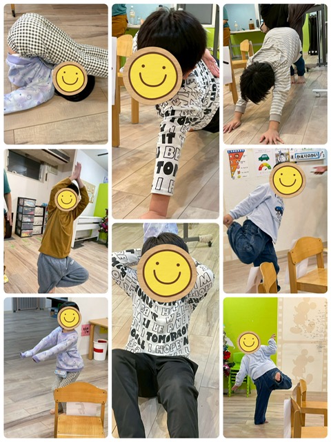 音楽が止まった時に目の前の椅子に貼られているポーズと同じポーズをとって止まる!!