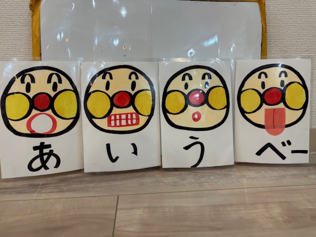 幼児さんは毎朝、朝の会でアンパンマンの顔の絵カードと同じ口の動きをして「あ」「い」「う」「べ」など発音。
